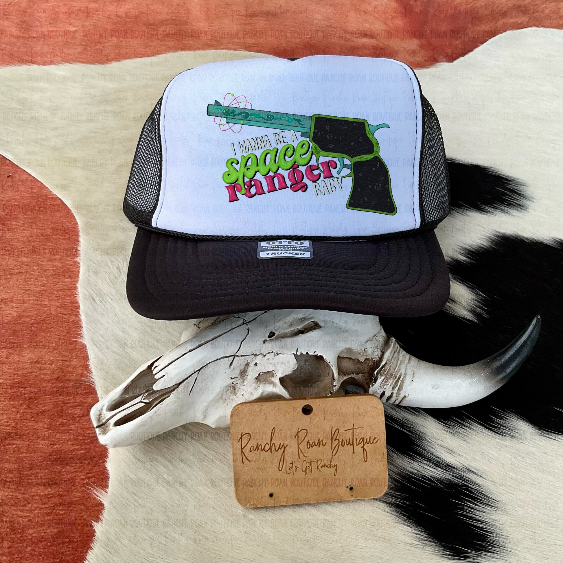 Retro meets cosmic cowgirl. The I Wanna Be a Space Cowboy Baby Trucker Hat features a bold graphic revolver with neon-inspired typography for that playful Western edge.